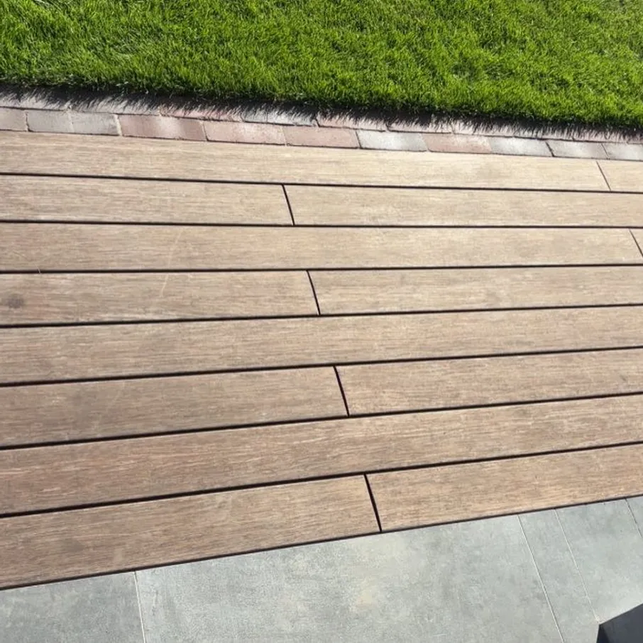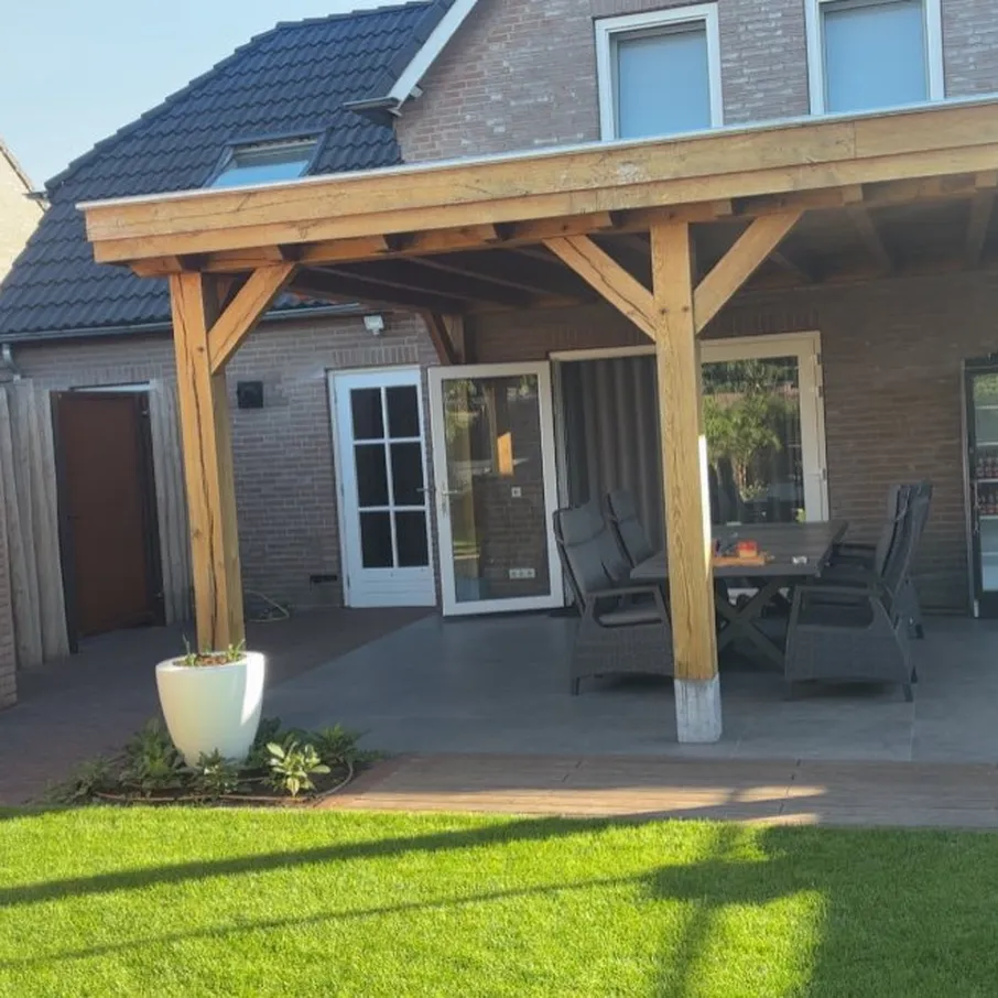 Uitgebreide familietuin met eiken overkapping en bamboe vlonder