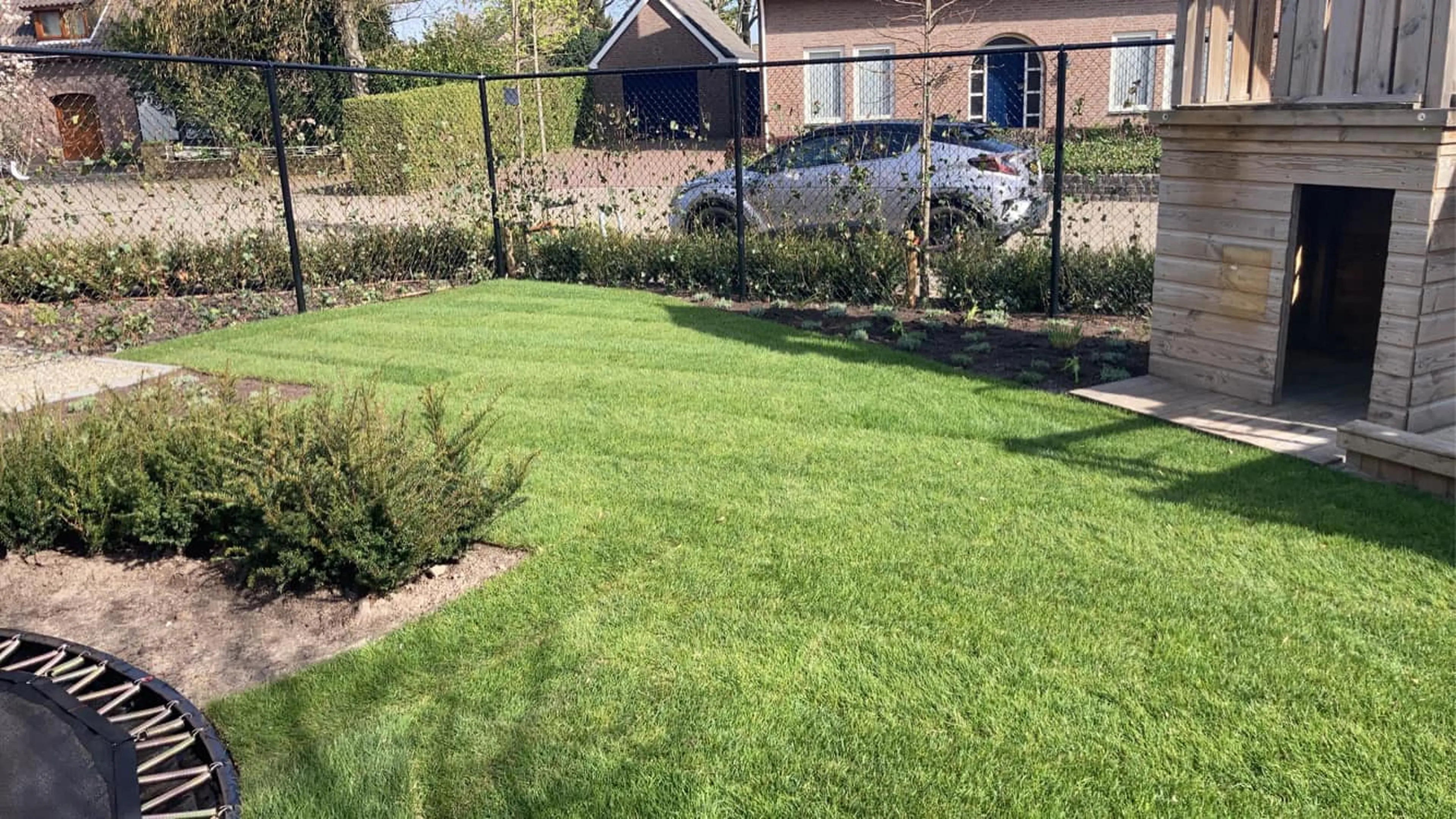 We zetten de puntjes op de i met het gazon en de beplanting. Pas als alles er strak bij ligt, zijn we klaar.